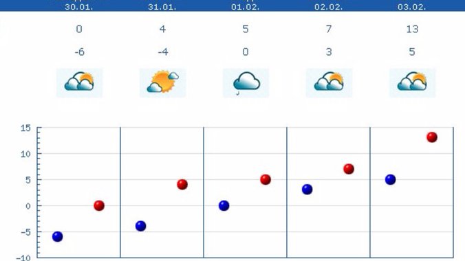 Posle podne očekuju se periodi sunčanog vremena. Vetar slab i umeren, jugoistočni, jutarnja temperatura od minus devet do minus šest stepeni, najviše dnevna oko nula stepeni.
