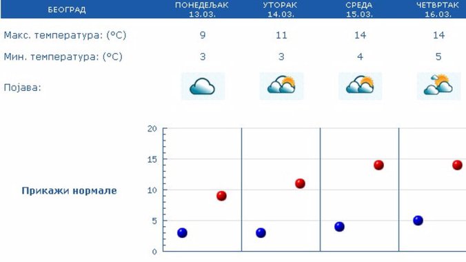 U utorak, sredu i četvrtak očekuje se promenljivo oblačno i uglavnom suvo vreme, samo ponegde u brdsko-planinskim predelima zapadne i južne Srbije sa slabom kisom, u višim planinskim predelima sa slabim snegom.