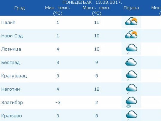 Jutarnja temperatura od 0 do 5 stepeni Celzijusevih, a najviša dnevna temeperatura biće od 6 do 12 stepeni Celzijusevih.