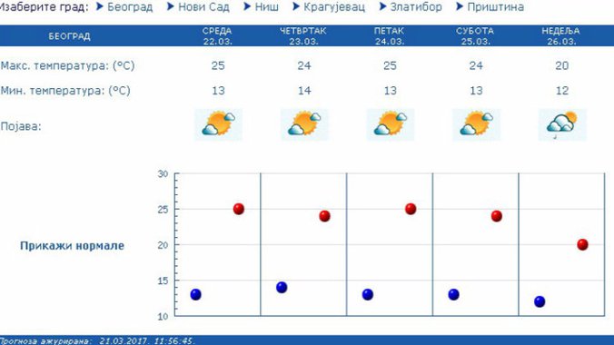 U Srbiji će do nedelje biti pretežno sunčano i toplo, s temperaturom znatno iznad prosečnih vrednosti za ovo doba godine, u većini mesta između 22 i 25 stepeni, a samo će u subotu poslepodne na zapadu i jugu Srbije biti promenljivo oblačno s lokalnim pljuskovima i grmljavinom. Od nedelje će biti promenljivo i hladnije, mestimično s kišom i lokalnim pljuskovima.