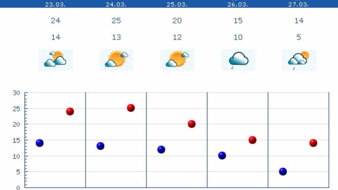 U većem delu zemlje duvaće slab do umeren vetar, a na jugu Banata jak. Jutarnja temperatura biće od sedam do 14 stepeni, a najviša dnevna od 22 do 26 stepeni.