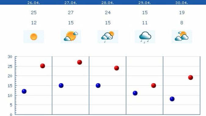 Duvaće slab i umeren, južni i jugozapadni vetar. Jutarnja temperatura od četiri do 12, najviša dnevna od 22 do 25 stepeni.
