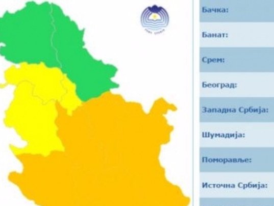 "Žuti" alarm je istaknut za zapadnu Srbiju, Beograd i Srem, dok su u najpovoljnijem položaju Bačka i Banat, gde nema upozorenje na vremenske nepogode.