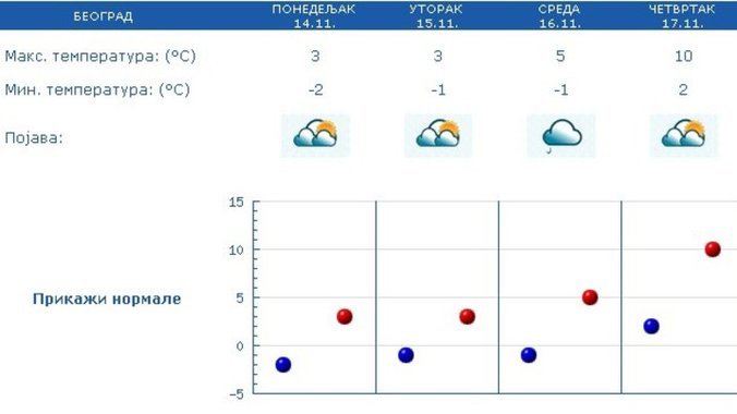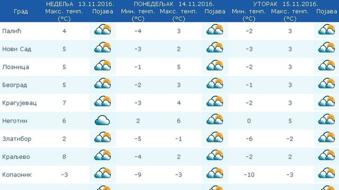 Jutarnja temperatura od -5 do -1, u Timockoj Krajini oko 2, najviša dnevna od 2 do 6 stepeni.