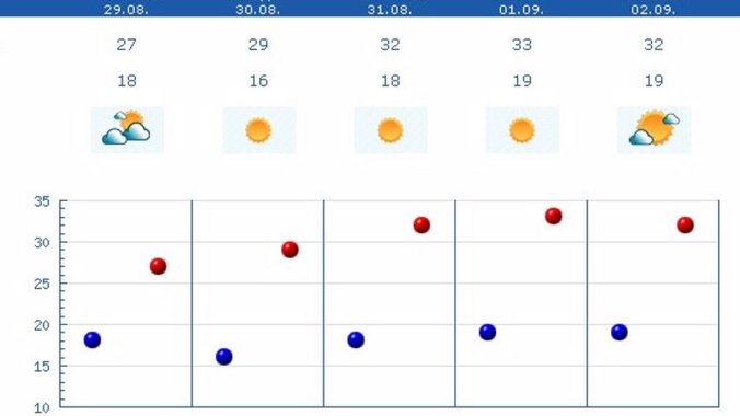 Posle podne će biti promenljivo oblačno i suvo. Duvaće slab i umeren severni vetar. Jutarnja temperatura od 13 do 18, najviša dnevna od 23 do 28 stepeni.