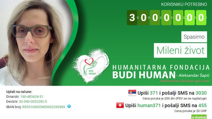 Humanitarna fondacija BUDI HUMAN Aleksandar Šapić prikuplja novčana sredstva za Milenu Jovanović (1984).