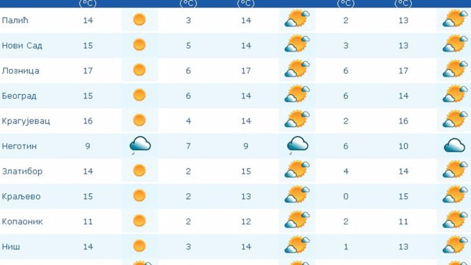 Najniža temperatura kretaće se od minus tri do osam, a najviša od 12 do 17 stepeni Celzijusa.