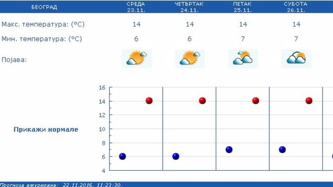 U Srbiji će u četvrtak ujutro biti mestimično magla i slab mraz, u toku dana u većem delu pretežno sunčano i toplo, u Timočkoj krajini oblačno i hladnije, a u košavskom području slabljenje jugoistočnog vetra. U petak će biti postepeno naoblačenje, posle podne i uveče ponegde na jugozapadu slaba kiša. U subotu i nedelju biće pretežno oblačno, mestimično slaba kiša, uglavnom u južnim i centralnim krajevima. U ponedeljak oblačno s kišom, zahlađenje, u planinskim predelima sneg, u toku noći slab sneg ponegde i u nižim predelima i u utorak i sredu pretežno oblačno i hladno, ponegde sa slabim snegom.