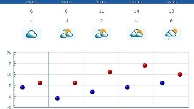 Najniža temperatura od 0 do 4 stepena, najviša dnevna od 4 na severu i zapadu do 8 stepeni na jugoistoku Srbije.
