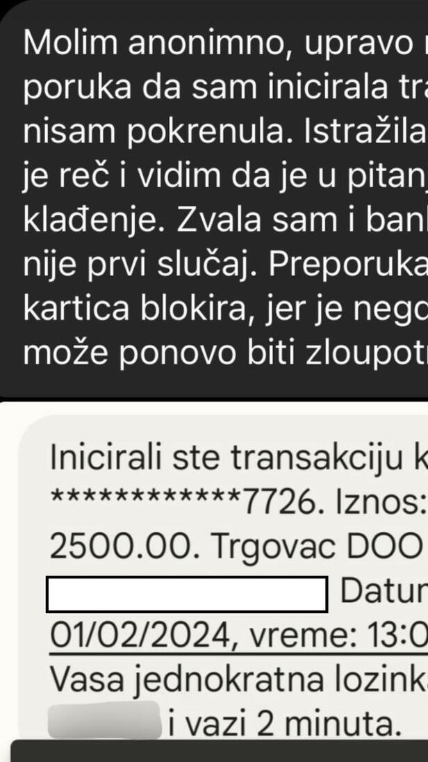 Potom se javila devojka kojoj je stigla ista poruka, ali su njoj prevaranti skinuli čak 53.000 dinara sa kartice. Navodno je reč o jednoj kladionici.