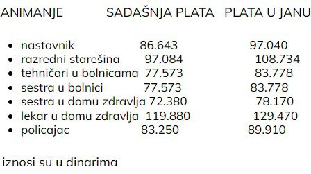 To praktično znači da će plata nastavnika od naredne godine uvećati za 10.000 dinara i umesto 86.643, iznosiće 97.040 dinara. Sa druge strane lekari mogu da očekuju nešto niže procente povećanja, jer će za njih one iznositi osam odsto, pa će umesto dosadašnjih 119.880 dinara, od sledeće godine primati 129.470 dinara.