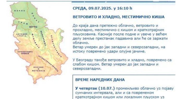 U četvrtak (10.07.) promenljivo oblačno uz pojavu sunčanih intervala, ali i sa povremenom kratkotrajnom kišom ili lokalnim pljuskom uz malu količinu padavina. U višim planinskim predelima ujutro i pre podne smanjena vidljivost zbog magle. Tokom dana duvaće umeren, povremeno jak severozapadni vetar. Najniža temperatura od 11 do 16 °S, a najviša od 21 do 25 °S.
