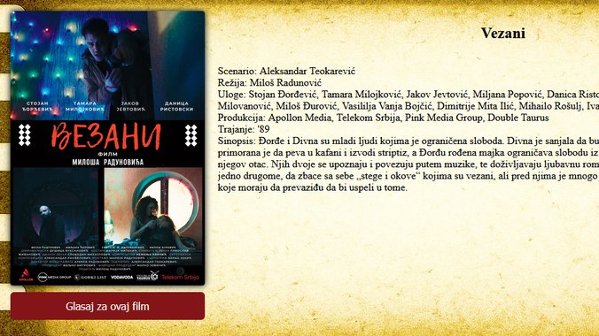 Podsetimo film "Vezani" otvorio je ovogodišnji festival koji je prošle godine dobio nagradu za najbolji scenario, a ove godine ,Tamara Milojković, upravo za taj film, dobila je nagradu za najbolju glumicu festivala.
