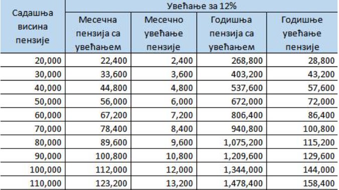 Na visinu penzije pre povećanja, koja iznosi 20.000 dinara, povećanje od 12 odsto iznosi 2.400 dinara, što znači da će penzija sa povećanjem u sklopu novih mera države iznositi 22.400 dinara — a uvećanje na godišnjem nivou će iznositi 28.800 dinara.
