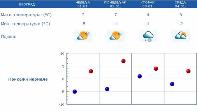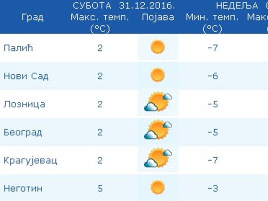 Jutarnja temperatura 1. januara biće od minus devet do minus tri, a najviša dnevna od nule do sedam stepeni, uz slab vetar, južnih pravaca, dok će u Timočkoj Krajini biti umeren, zapadni vetar.