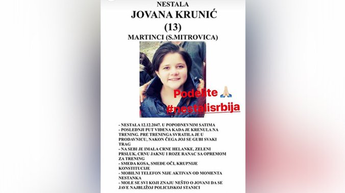 Jovana Krunić (13) iz naselja Martinci u opštini Sremska Mitrovica nestala je 12. decembra u popodnevnim satima.