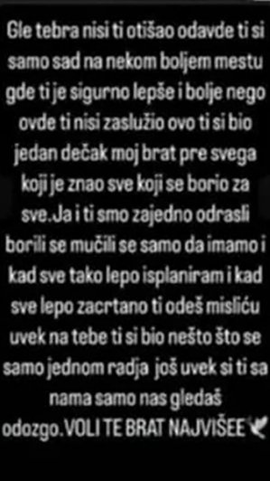- Gle tebra, nisi ti otišao odavde, ti si sada samo na nekom boljem mestu gde ti je sigurno lepše i bolje nego ovde. Ti nisi zaslužio ovo! Ti si bio jedan dečak, moj brat, pre svega koji je znao da se bori za sve. Ti i ja smo zajedno odrasli, borili se, mučili se samo da imamo. I kada je sve tako lepo isplanirano i zacrtano ti odeš! Misliću uvek na tebe, ti si bio nešto što se samo jednom rađa. Ti si još uvek sa nama, samo nas gledaš odozgo. Voli te brat najviše! - pisalo je u emotivnoj poruci koju je posvetio rođenom bratu Nemanji.