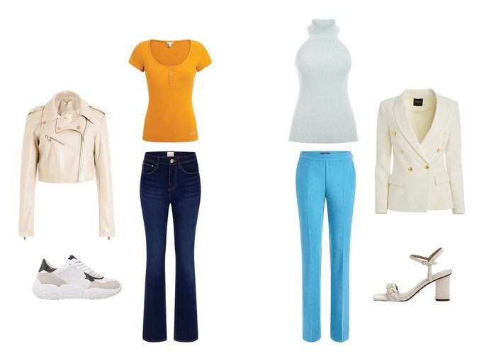 bež jakna patike narandžasta majica tamnoplave farmerke Marciano beli sako elegantne pantalone rebrasti top bele sandale