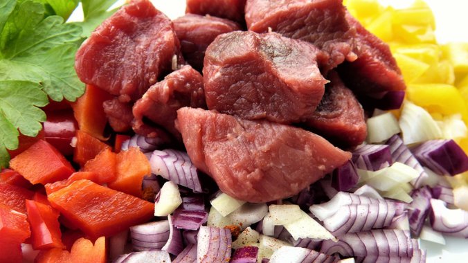 Sastojci: 960 g karabataka (bez kostiju), 1 kašičica dimljene mlevene paprike, 1,5 kašičica tečnog dima, oko 30 ml maslinovog ulja, 220 g dimljene slanine, 4 crna luka, 1 glavica belog luka, 1 veća crvena ljuta papričica, 10 pečenih paprika iz tegle, 3 suve paprike, 1 konzerva seckanog pelata.