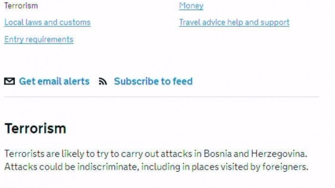 Vlada Velike Britanije objavila upozorenje za svoje građane koji planiraju putovanje u BiH da će sledeći teroristički napad 'verovatno' biti u toj zemlji... Mete mogu biti i mesta koja posećuju stranci, piše u saopštenju
