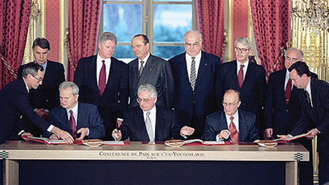 Dejtonski sporazum, nakon tronedeljnih pregovora, parafirali su tadašnji predsednici Srbije Slobodan Milošević, takozvane Republike BiH Alija Izetbegović i Hrvatske Franjo Tuđman.