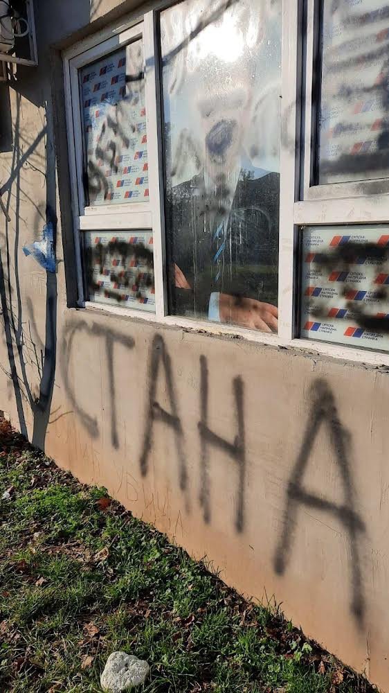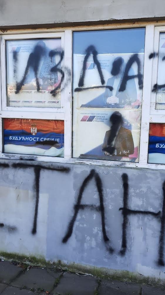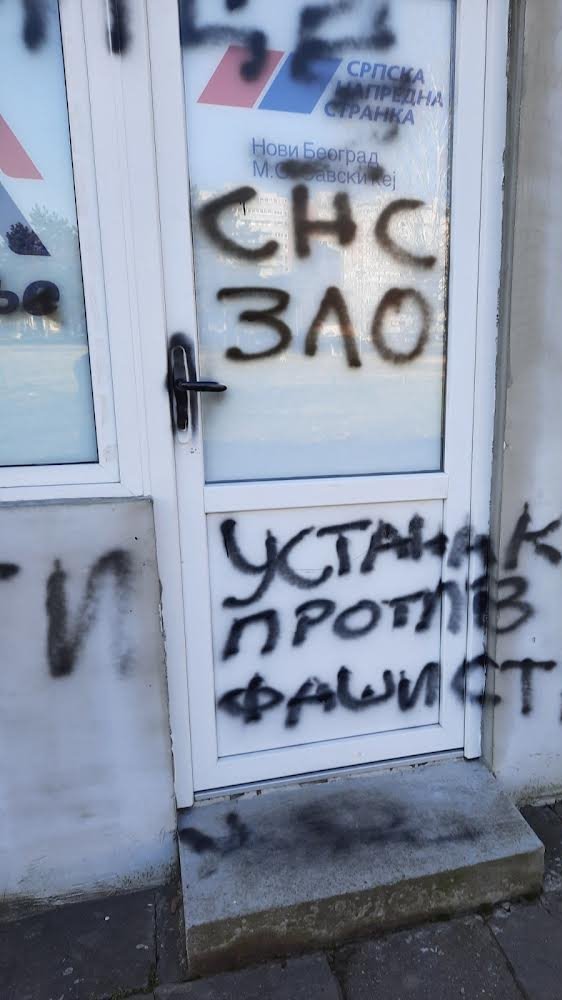 Opštinski odbor Srpske napredne stranke Novi Beograd obaveštava javnost da su sinoć napadnute i oštećene prostorije Nepoznati počinioci kamenovali su prostorije i ispisali grafite na kojima su poruke mržnje, kao i pretnje aktivistima SNS.