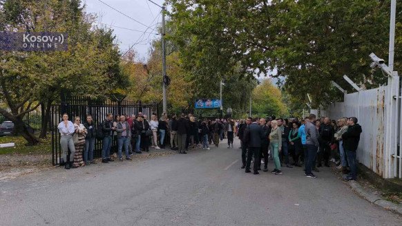 Okupljeni duvaju u pištaljke i nose transparente na kojima je prikazan kosovski premijer Aljbin Kurti sa natpisom "Sudija, porota i izvršitelj", kao i "Samo nek ide po redu".