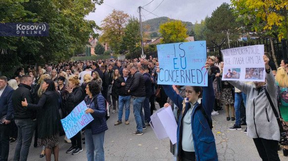 Pojedinci nose i fotografije ranjenih mladića iz Štrpca na kojima piše "Od tvoje demokratije, plava sam ja", ali i transparente sa natpisom: "Da li je EU zabrinuta?".