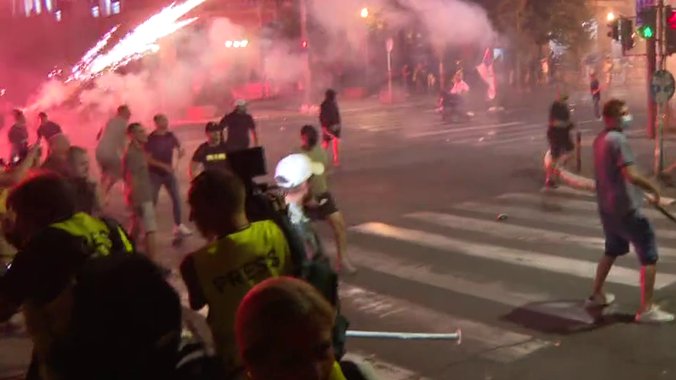 Blokaderi teroristi gađali su pristalice SNS ispred stranačkih prostorija na Savskom vencu, a onda napali policiju i gađali ih bakljama.