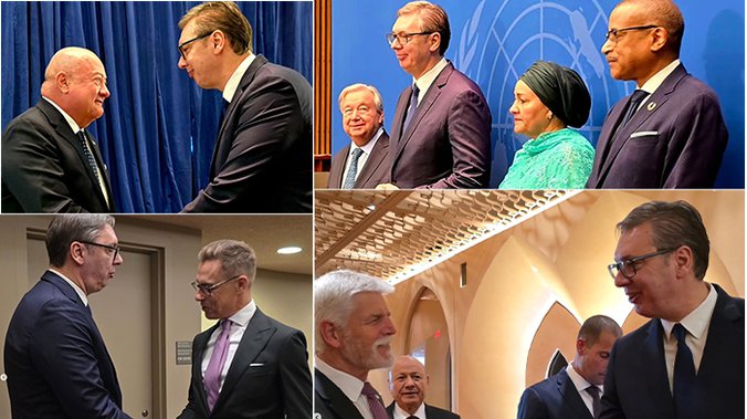 - Sa austrijskim kancelarom Kristijanom Štokerom, predsednikom Republike Finske Aleksanderom Štubom, predsednikom Češke Republike Petrom Pavelom, predsednikom Sirijske Arapske Republike Ahmedom al Šarom i generalnim sekretarom Ujedinjenih nacija Antonijom Guterešom, pred otvaranje 80. sednice Generalne skupštine UN - napisao je Vučić na Instagramu.
