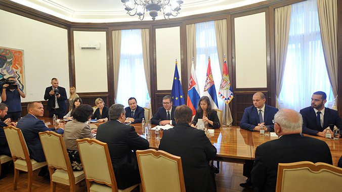 Predsednik Vučić je konstatovao da su bilateralni odnosi Srbije i Slovačke veoma dobri i prijateljski, ne samo zbog toga što Slovačka ne priznaje jednostrano proglašenu nezavisnost Kosova, već i zbog iskrenog bratstva srpskog i slovačkog naroda, čijih više od 50.000 pripadnika živi u Srbiji.