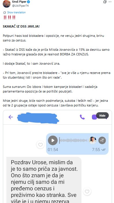 - Pri tom, Jovanović prezire blokadere - "sve je više u njemu rezerve prema tzv studentskoj listi i onom što oni rade" - navodi Piper i konstatuje da će se do izbora i tokom kampanje blokaderi i sadašnja parlamentarna opozicija će se politički poubijati.