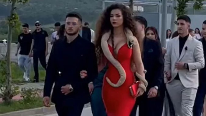 Naime, crnokosa, kovrdžava devojka na početku snimka predvodi defile maturanata u pripijenoj crvenoj haljini, dok joj se oko vrata preko grudi pa do struka proteže zmija.