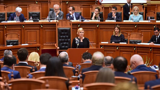 Drugog dana zvanične posete Tirani, hrvatska predsednica Kolinda Grabar Kitarović je, obraćajući se u parlamentu, osim kurtoazne podrške putu Albanije ka EU, poručila da su Hrvati i Albanci "doslovce braća po oružju".