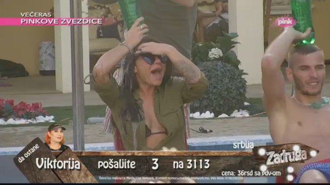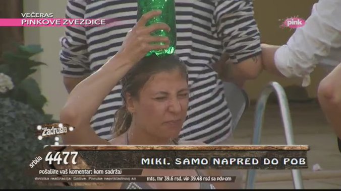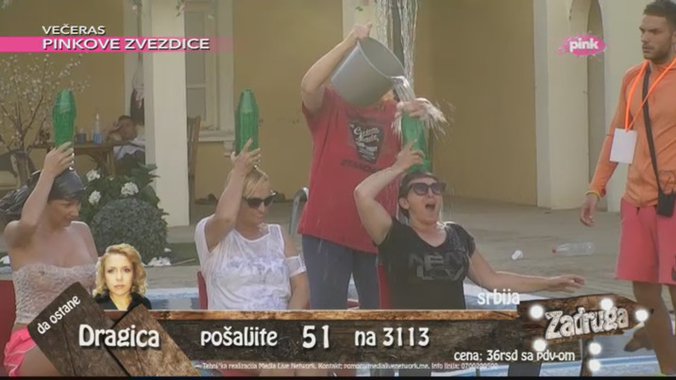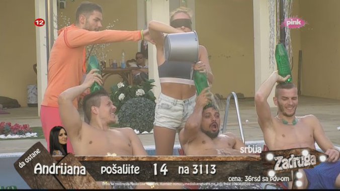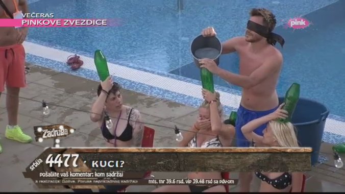 Da bi postali pobednički tim, bilo je potrebno da za što kraće vreme napune flaše sa vodom. Miljana Kulić je u prvu grupu raspodelila Marka Miljkovića, Teodoru Džehverović, Milana Miloševića i Kristinu Kockar, pa su upravo ovi ukućani otvorili igru pored bazena.