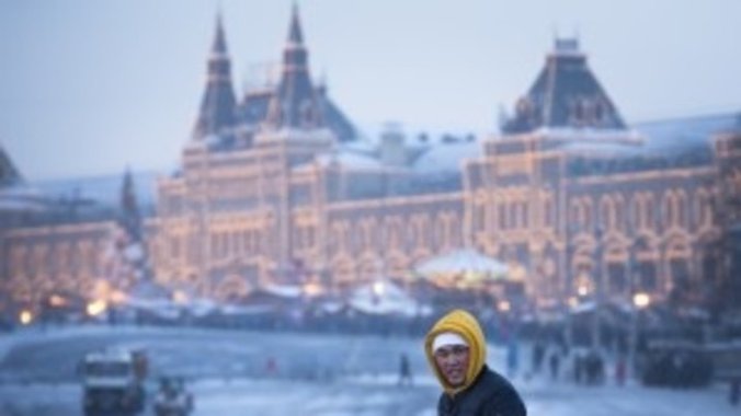 Foto: An Asian tourist poses for a photo on a bridge over the frozen Moskva River in Moscow, Russia, Monday, Jan. 4, 2016, with Red Square and GUM State Department store decorated with New Year and Christmas illumination . Temperatures dipped to -18 C (-0,4 ...