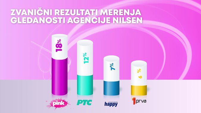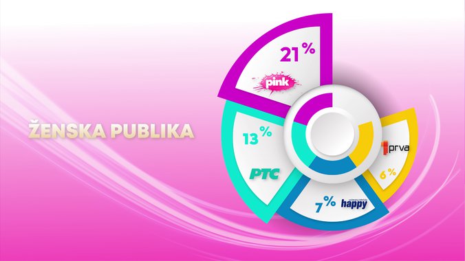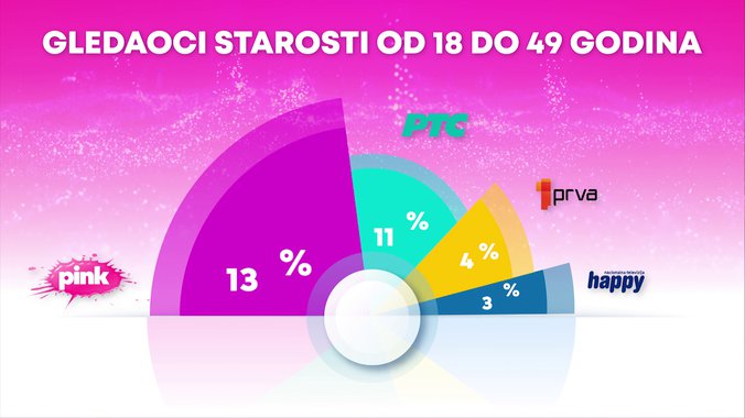 Televizija Pink je od svih komercijalnih emitera, ali i Javnog servisa Srbije bila gledanija u totalu, među ženskom publikom, među gledaocima starosti od 18 do 49 godina, među ženskom publikom starosti od 18 do 49 godina, među gledaocima sa teritorije Beograda i među urbanom populacijom, dok je od svih komercijalnih televizija bila gledanija među gledaocima iz prestonice starosti od 18 do 49 godina.