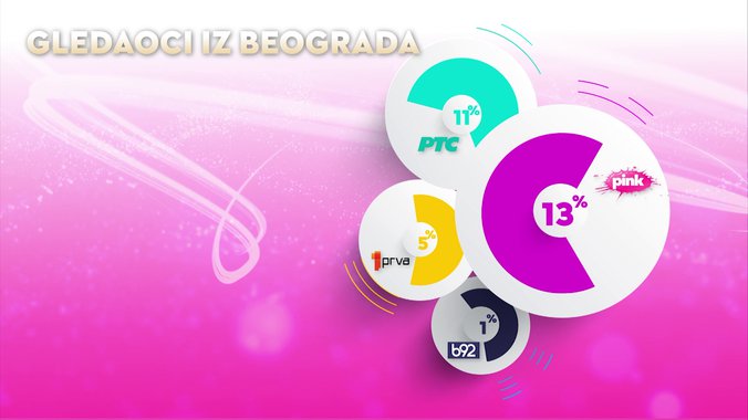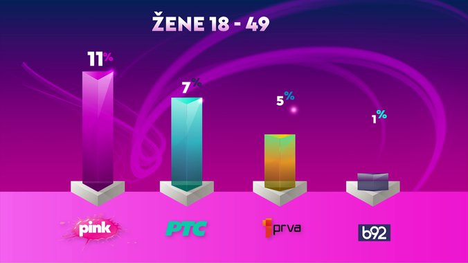 Televizija Pink je od svih komercijalnih emitera, ali i Javnog servisa Srbije bila gledanija u totalu, među ženskom publikom, među ženskom publikom starosti od 18 do 49 godina, među gledaocima sa teritorije Beograda, među gledaocima iz prestonice starosti od 18 do 49 godina i među urbanom populacijom, dok je od svih komercijalnih televizija bila gledanija među gledaocima starosti od 18 do 49 godina.
