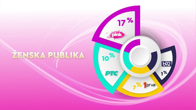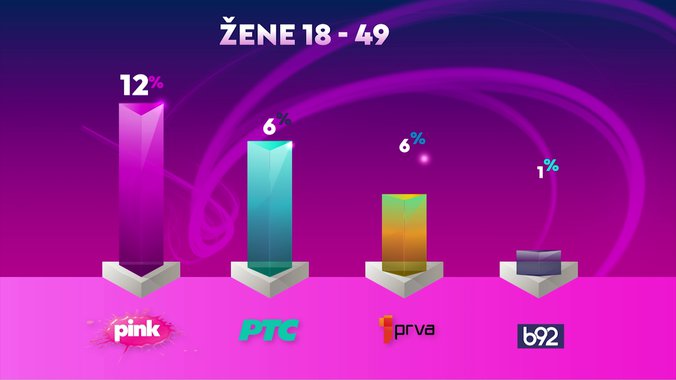 Televizija Pink je od svih komercijalnih emitera, ali i Javnog servisa Srbije bila gledanija u totalu, među ženskom publikom, među gledaocima starosti od 18 do 49 godina, među ženskom publikom starosti od 18 do 49 godina, među gledaocima sa teritorije Beograda, među gledaocima iz prestonice starosti od 18 do 49 godina, kao i među urbanom populacijom.