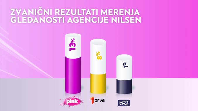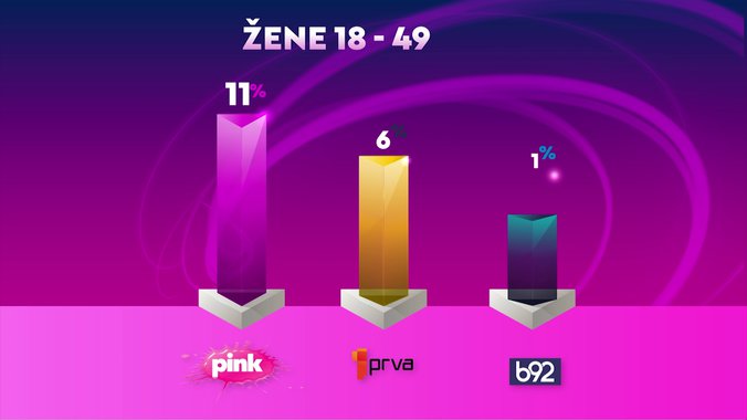 Televizija Pink je od svih komercijalnih emitera bila gledanija u totalu, među gledaocima starosti od 18 do 49 godina, među ženskom publikom starosti od 18 do 49 godina i među urbanom populacijom, dok je i od Javnog servisa Srbije bila gledanija među ženskom publikom, među gledaocima sa teritorije Beograda, kao i među gledaocima iz prestonice starosti od 18 do 49 godina.