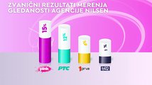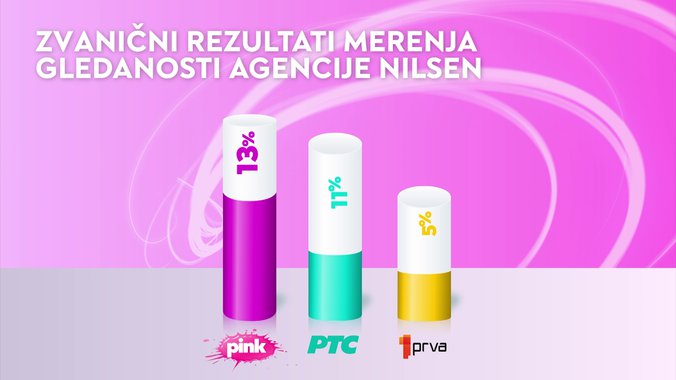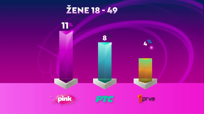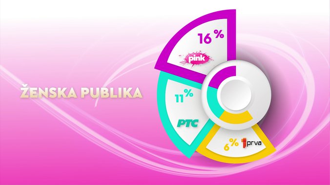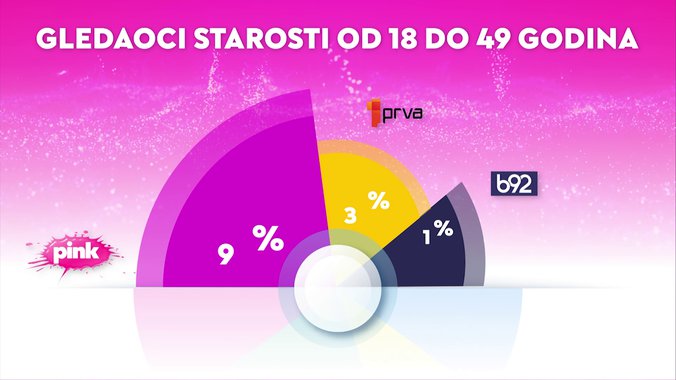 Televizija Pink je od svih komercijalnih emitera, ali i Javnog servisa Srbije bila gledanija u totalu... među ženskom publikom.... među ženskom publikom starosti od 18 do 49 godina... među gledaocima sa teritorije Beograda.... među gledaocima iz prestonice starosti od 18 do 49... i među urbanom populacijom, dok je od svih komercijalnih televizija bila gledanija među gledaocima starosti od 18 do 49 godina.
