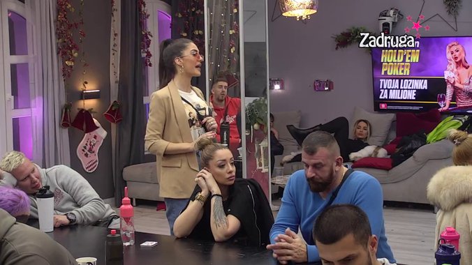 Voditeljka Ivana Šopić je najavila naredni klip u emisiji "Gledanje snimaka". Zadrugari su dobili priliku da vide kako Ana Ćurčić proziva Anđelu Đuričić i naziva je narcisom i najvećom gutalicom na planeti.