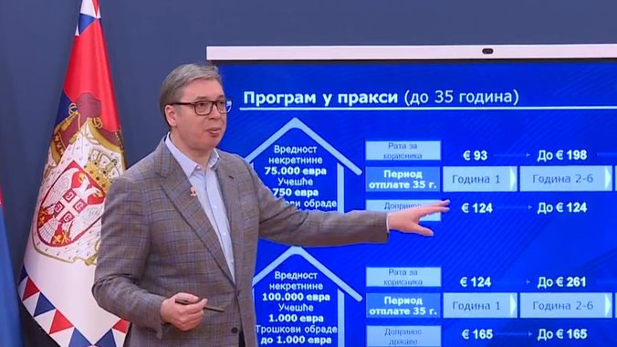 - Za svakog mladog čoveka koji je zaposlen, studenta, minimalno učešće je 1 posto. Ako ima šara, može da plati i više. Period je do 40 godina, a poslednja isplata najviše u 70 godini života. Možete ići i na kraće. Prevremena otplata kredita je bez naknade - kaže Vučić.