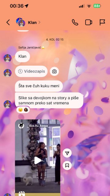 - Šta sve čuh, kuku meni. Slike sa devojkom na stori,a piše sa mnom preko sat vremena - napisala je Sofija, a ispod se vidi i reakcija Sandre Obradović na njenu poruku.