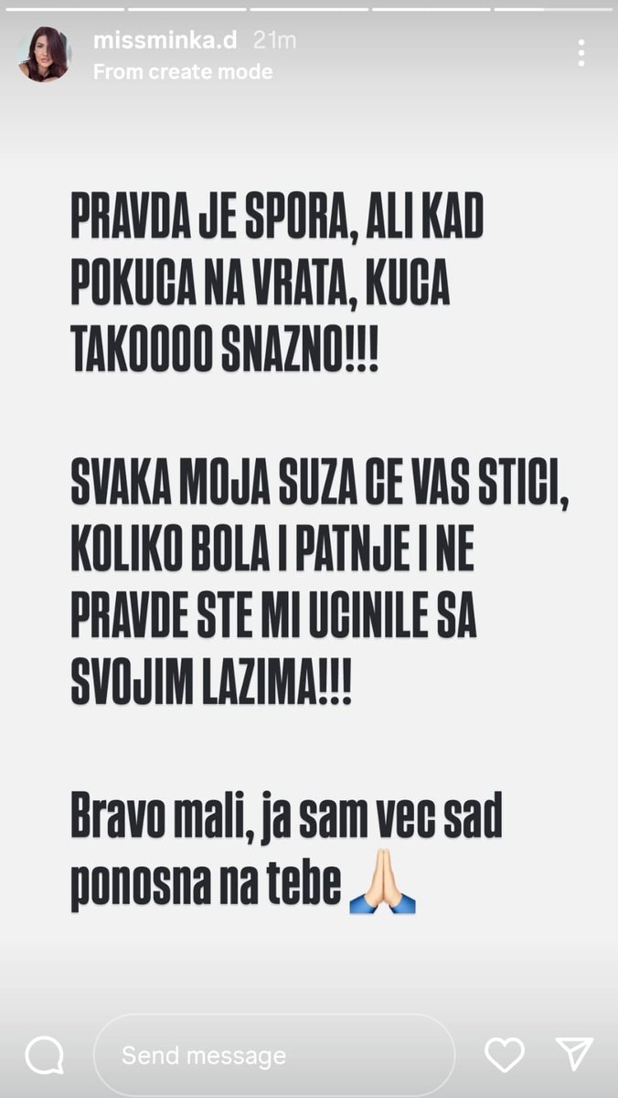 Minka se oglasila na svom zvaničnom Instagram profilu, gde je poručila da je pravda spora, ali dostižna.