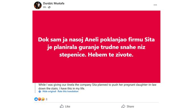 - Dok sam ja našoj Aneli poklanjao firmu, Sita je planirala guranje trudne snahe niz stepenice - napisao je Mustafa.