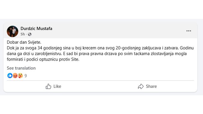 - Dobar dan svete! Dok ja za svog 34. godišnjeg sina u boj krećem, ona svog dvedesetogodišnjeg zaključava i zatvara. Godinu dana ga drži u zarobljeništvu, sada bi mogla biti podignuta optužnica protiv Site - napisao je Mustafa.