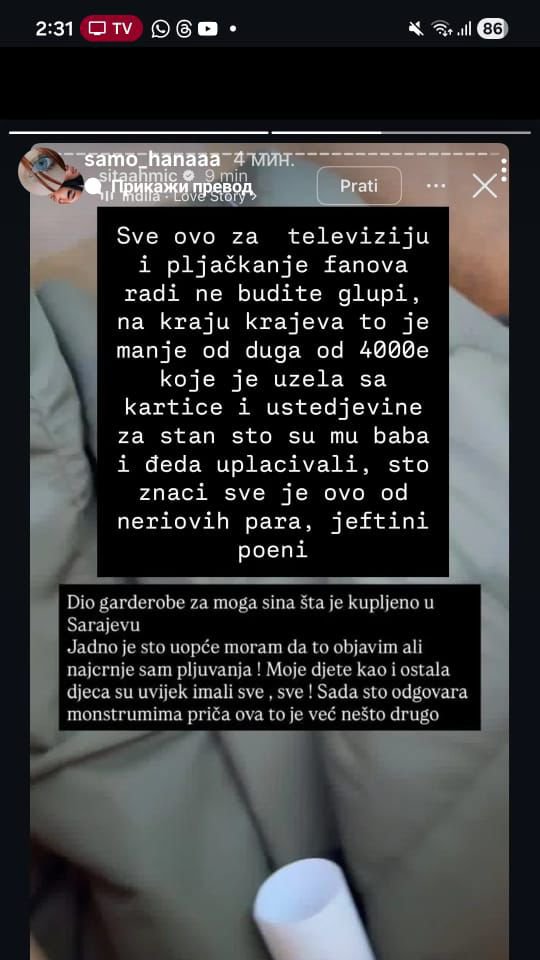 - Sve je ovo za televiziju i pljačkanje fanova, ne budete glupi. Na kraju Krajeva to je manje od duga od 4000 evra koje je nuzela sa kartice i ušteđevine za stan, što su mu baba i deda uplaćivali, što znači sve je ovo od Neriovih para, jeftini penei. - napisala je Hana i za Sitin komentar,
